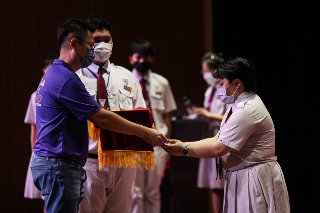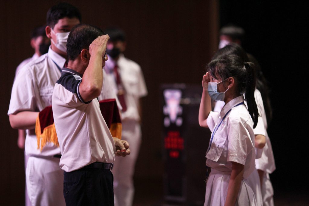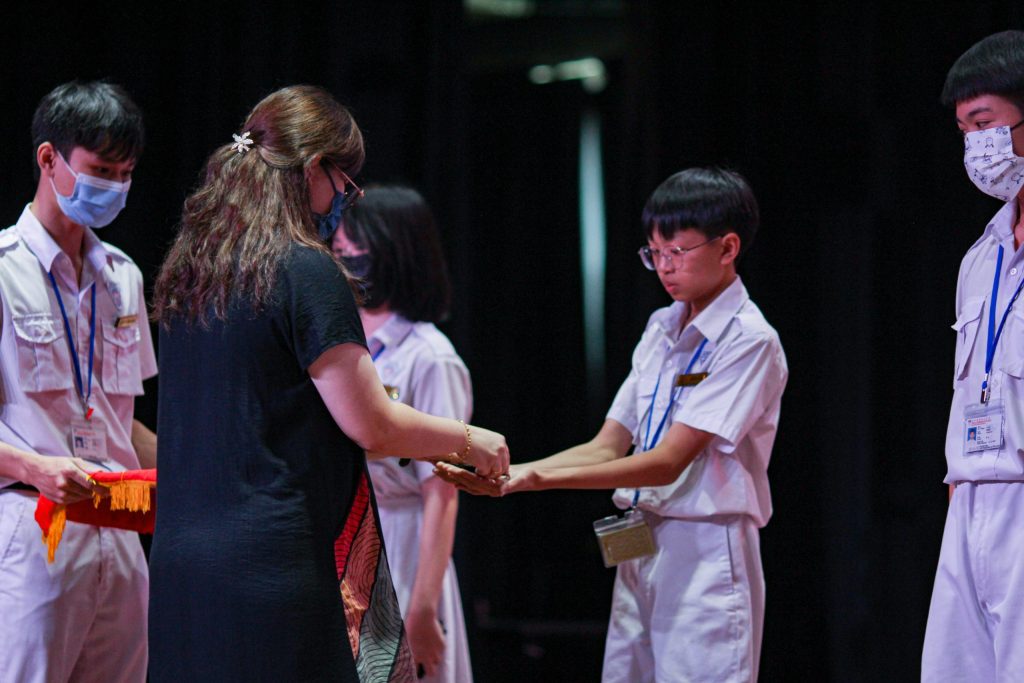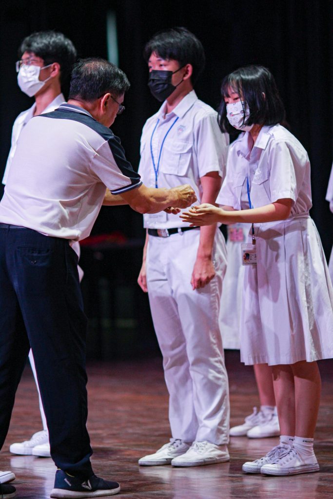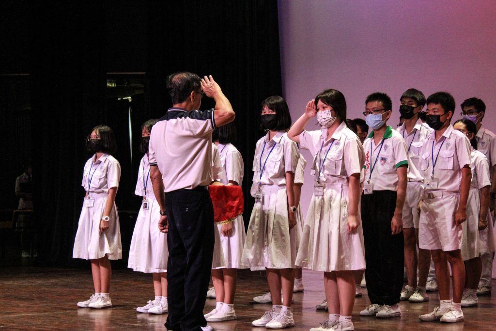 会上,由三大制服团体主席 陈柔妤(学长团)、杨翰霖(学生警察)、钟溢城(圣约翰救伤队),带领三大制服团体同学进行就职宣誓。之后,分别由五位出席嘉宾为三大制服团体的全体同学,颁授予名牌、团徽与肩章,象征着同学们经过考核,成为合格的制服团体一员,并将继续为学校履行站岗服务之责。