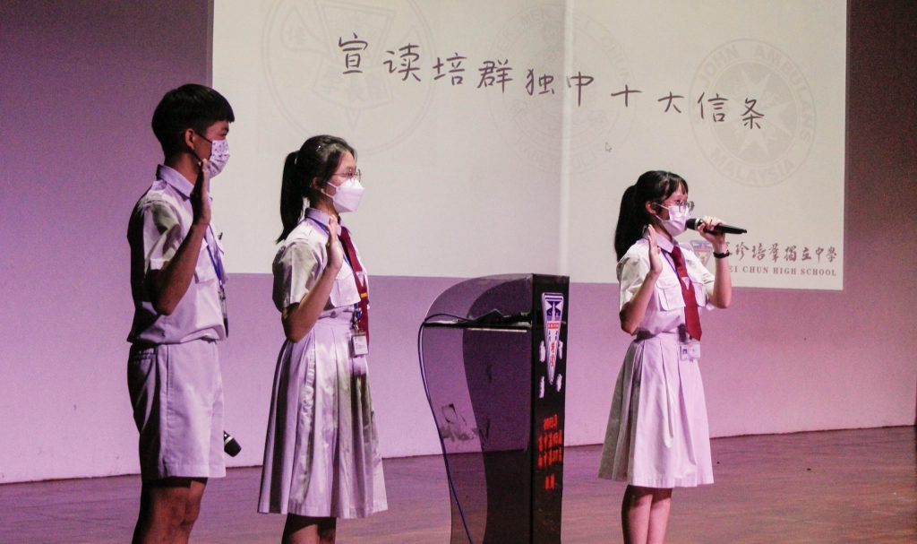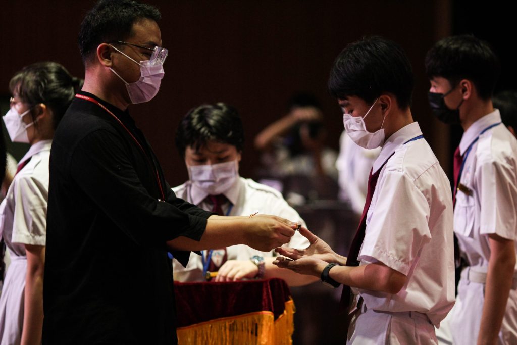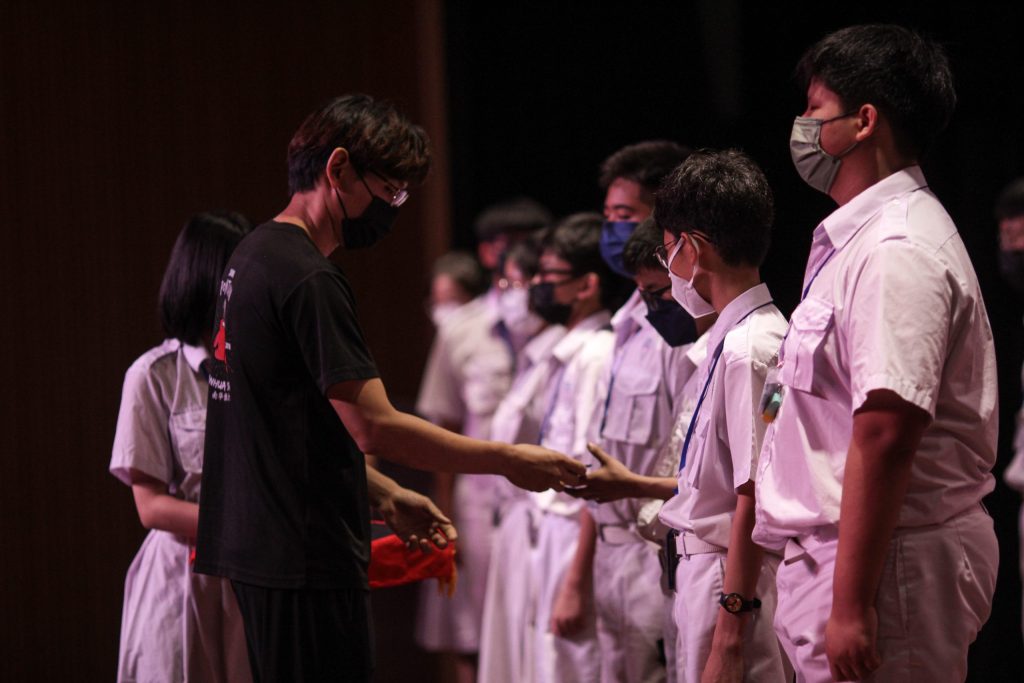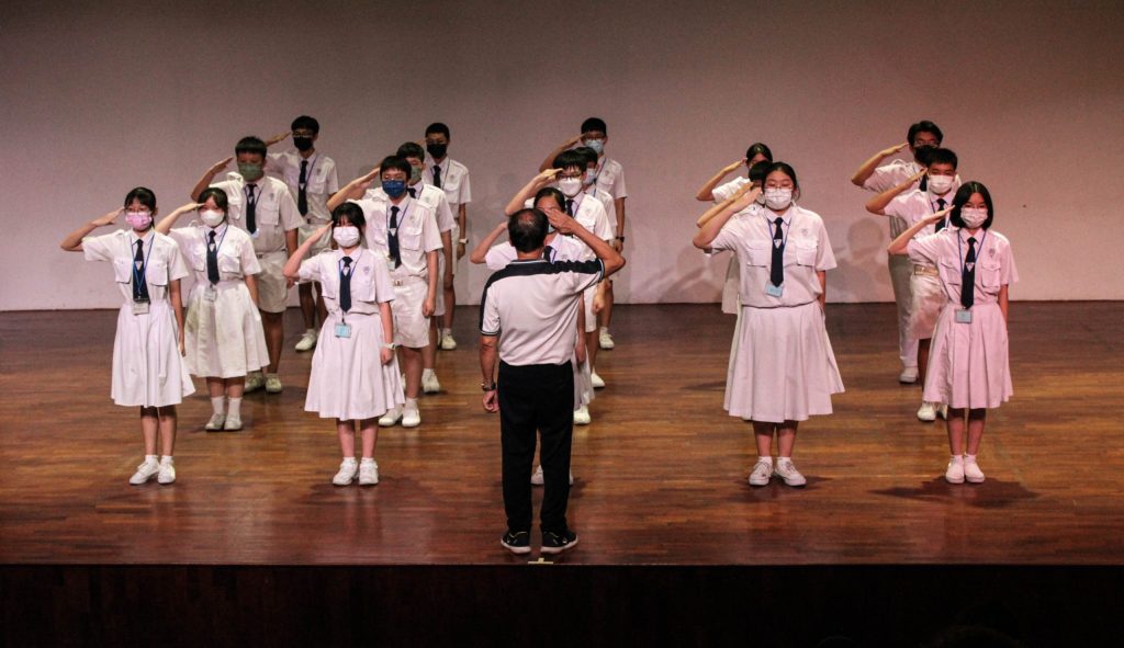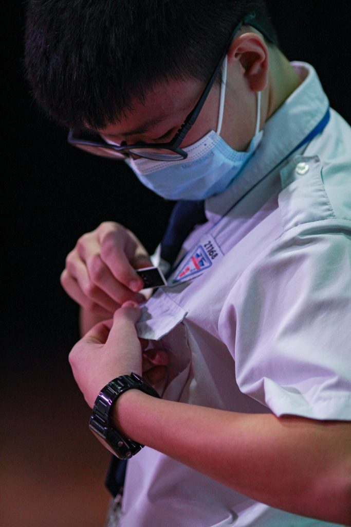 会上,由三大制服团体主席 陈柔妤(学长团)、杨翰霖(学生警察)、钟溢城(圣约翰救伤队),带领三大制服团体同学进行就职宣誓。之后,分别由五位出席嘉宾为三大制服团体的全体同学,颁授予名牌、团徽与肩章,象征着同学们经过考核,成为合格的制服团体一员,并将继续为学校履行站岗服务之责。