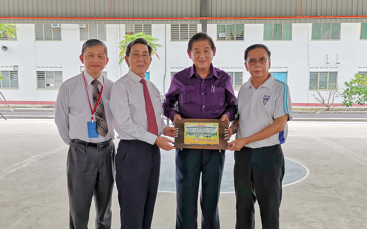 培群独中建校工委会主席拿督罗烈贤、董事长林青赋赠送纪念品予皇室拿督陈英文。右起:林青赋、皇室拿督陈英文、拿督罗烈贤与黄金贵。
