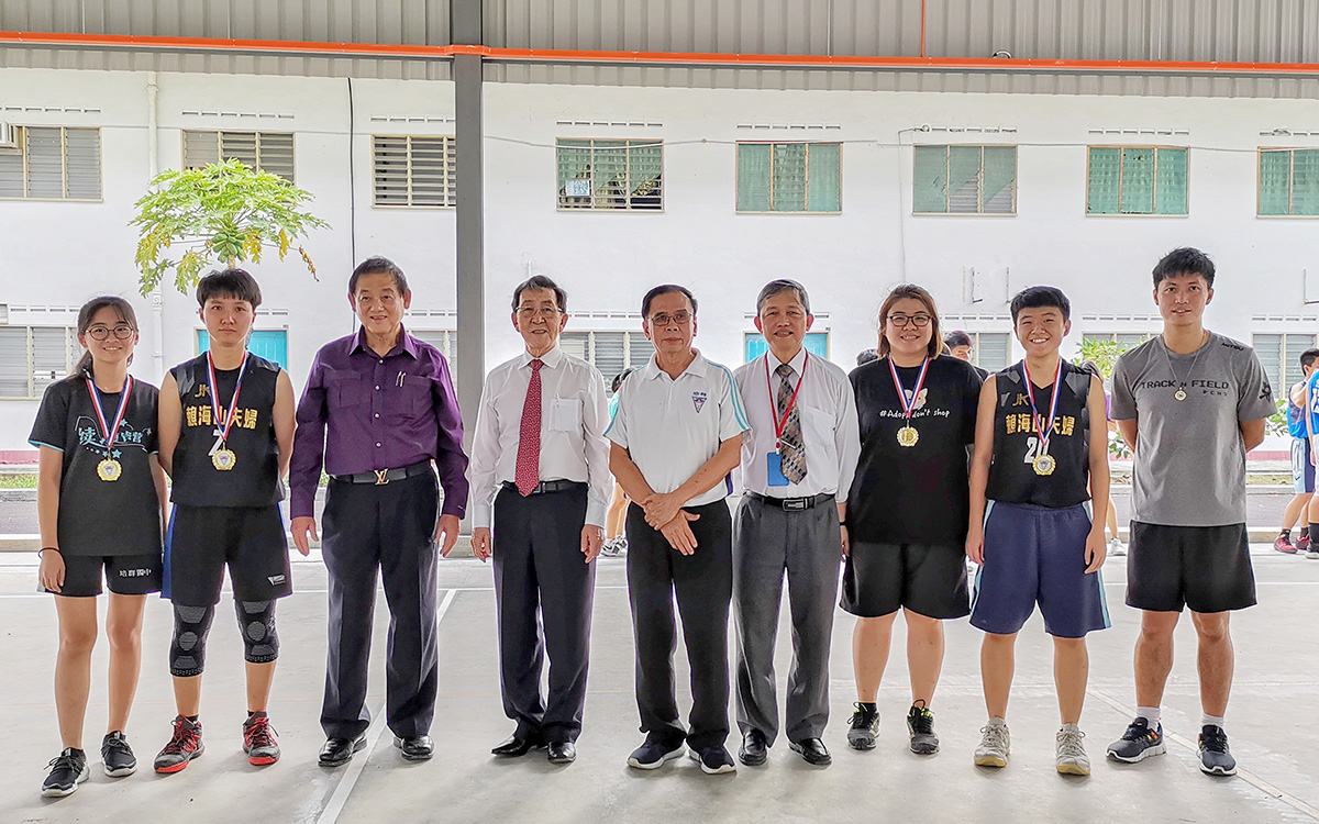嘉宾们与三人篮球赛得奖师生合影留念。左三起为皇室拿督陈英文、拿督罗烈贤、林青赋与黄金贵。
