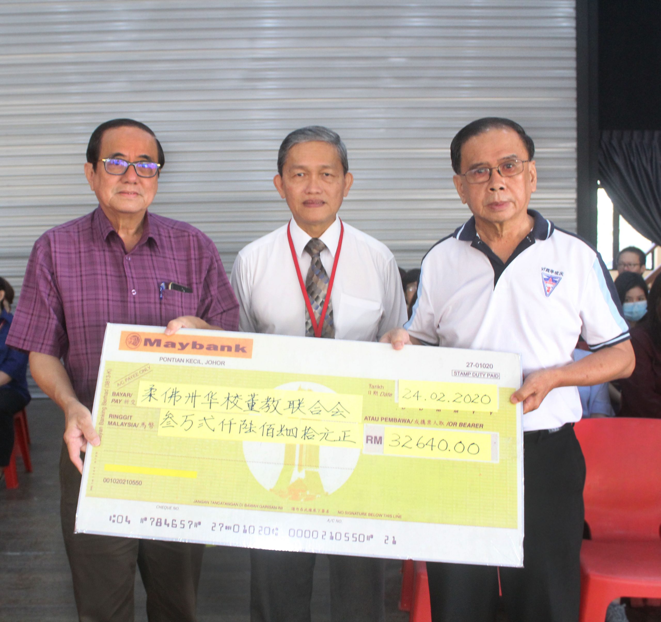 培群独中董事长林青赋与校长黄金贵移交模拟支票,由陈中华代表柔佛州董联会接领。右起:林青赋、黄金贵与陈中华。