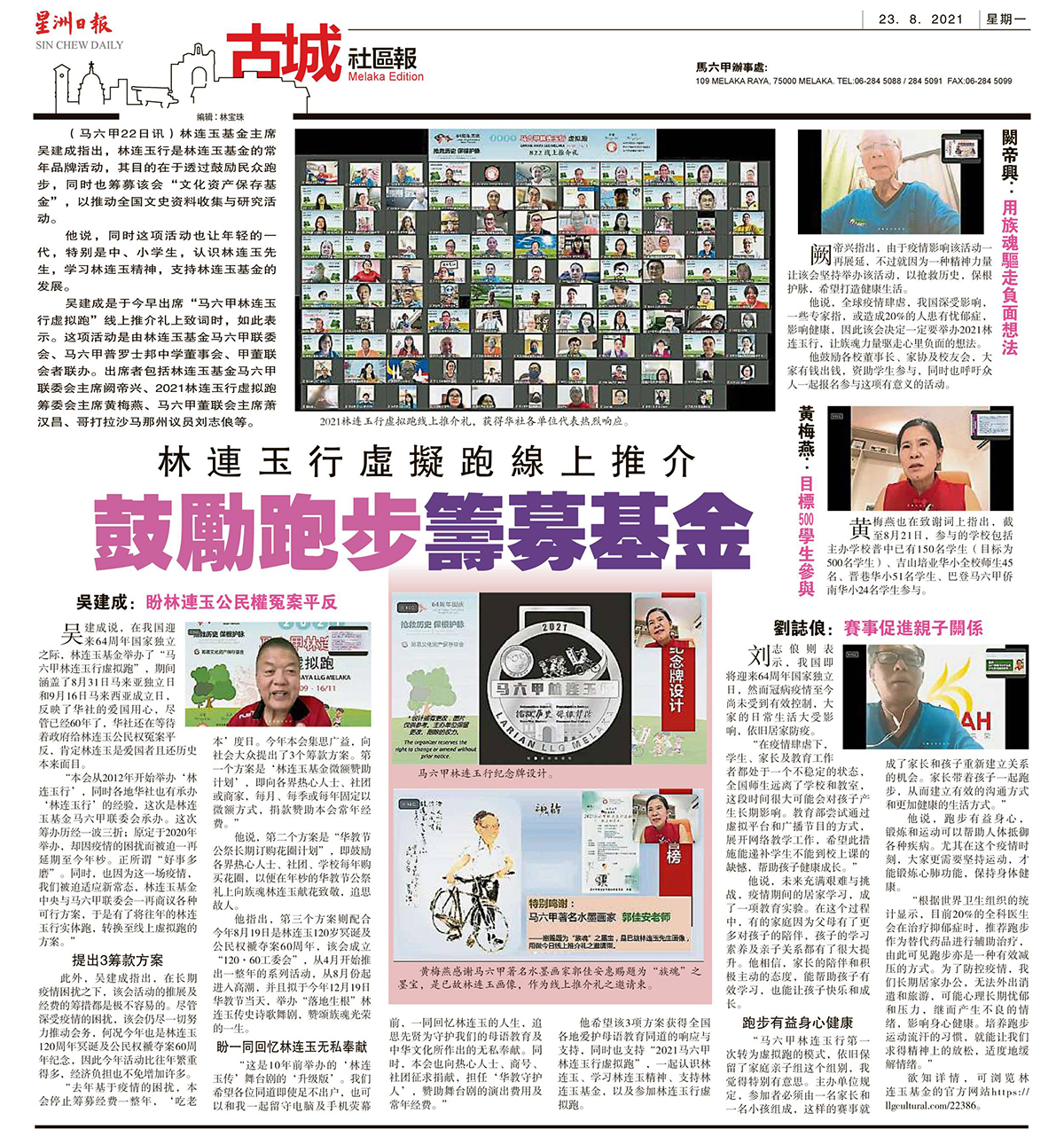 “本会从2012年开始举办‘林连玉行’,同时各地华社也有承办‘林连玉行’的经验,这次是林连玉基金马六甲联委会承办。这次筹办历经一波三折;原定于2020年举办,却因疫情的困扰而被迫一再延期至今年杪。正所谓“好事多磨”。同时,也因为这一场疫情,我们被迫适应新常态,林连玉基金中央与马六甲联委会一再商议各种可行方案,于是有了将往年的林连玉行实体跑,转换至线上虚拟跑的方案。”