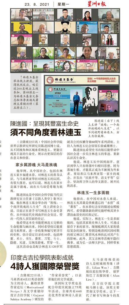 陈进国也是中国社会科学院当代宗教研究室主任兼《宗教人类学》集刊主编,他在林连玉基金举办的“族殓:一个南洋族魂的人生史”线上讲座会上说,目前正在着手书写林连玉生命史着作,从中国近代史到南洋社会变迁,带出一代伟人多层面的史记。