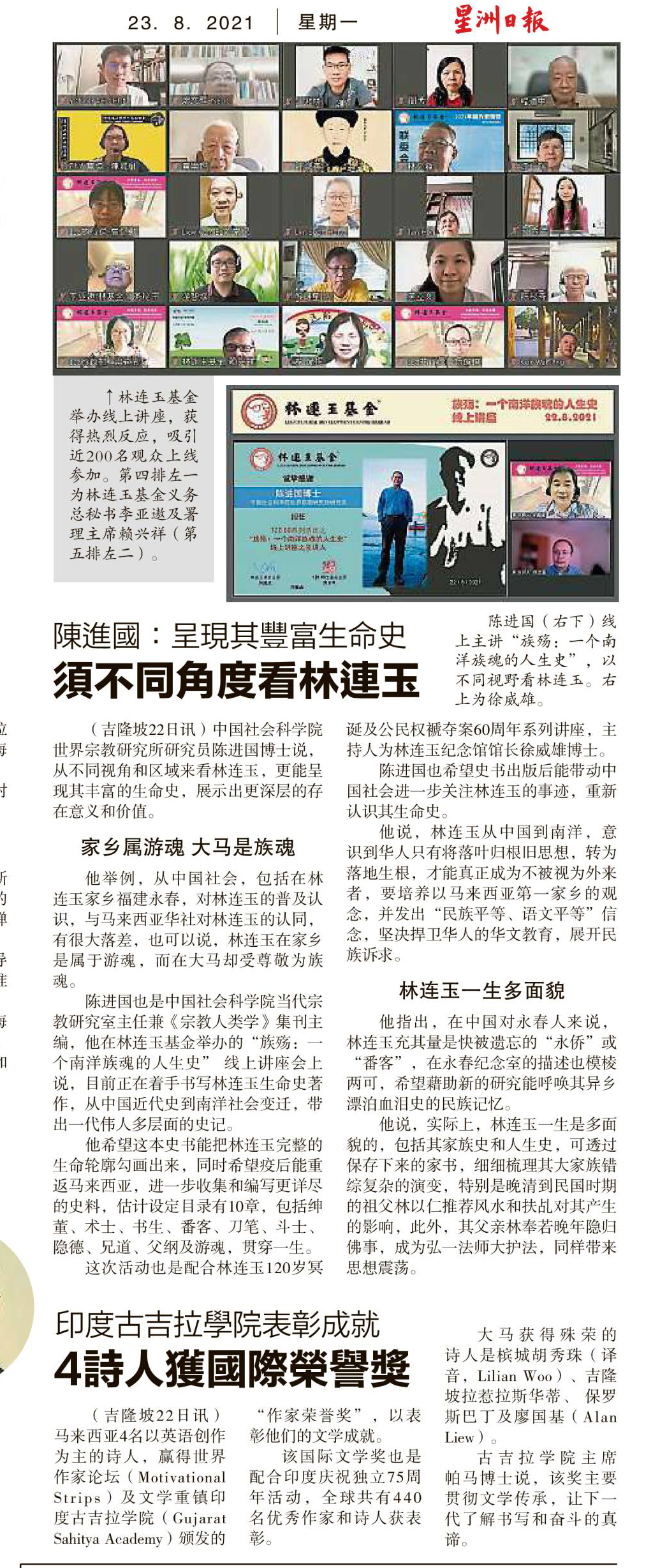 陈进国(右下)线上主讲“族荡:一个南洋族魂的人生史”,以不同视野看林连玉,右上为徐威雄。