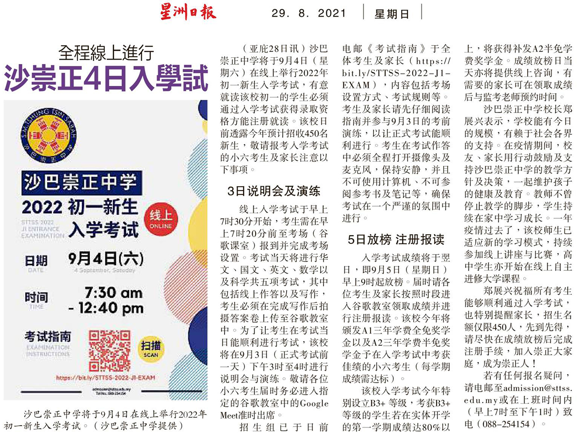 (亚庇28日讯)沙巴崇正中学将于9月4日(星期六)在线上举行2022年初一新生入学考试,有意就读该校初一的学生必须通过入学考试获得录取资格方能注册就读。该校日前透露今年预计招收450名新生,敬请报考入学考试的小六考生及家长注意以下事项。