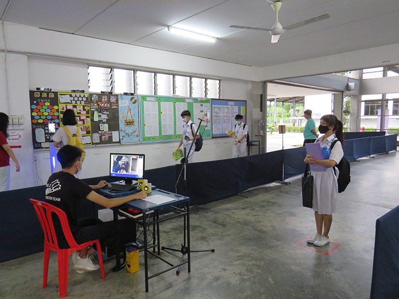 为了今天的复课,培群独中做足了充分准备,开辟三条检测通道,以较好地疏散人流。在各检测站,学生有序排队测量体温。体温正常的同学按照指定路线到达所属课室。一些分在两个课室的同一班级,则通过直播同步聆听老师的讲课。根据观察,学生们对这样的教学方式感到新鲜,与授课老师互动频繁,学习氛围浓厚。