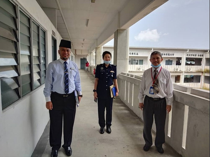 笨珍教育局私立学校组官员Tuan Rizal与笨珍警区警官Puan Tan Ann Ann莅临培群独中,关心学校的复课情形。右1为培群独中校长黄金贵。