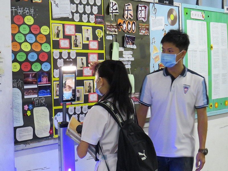 培群独中设置三条检测通道,复课的学生有序排队测量体温。校方感激培群独中校友会与绿驰通讯捐赠测量仪,大幅增加体温检测的效率。