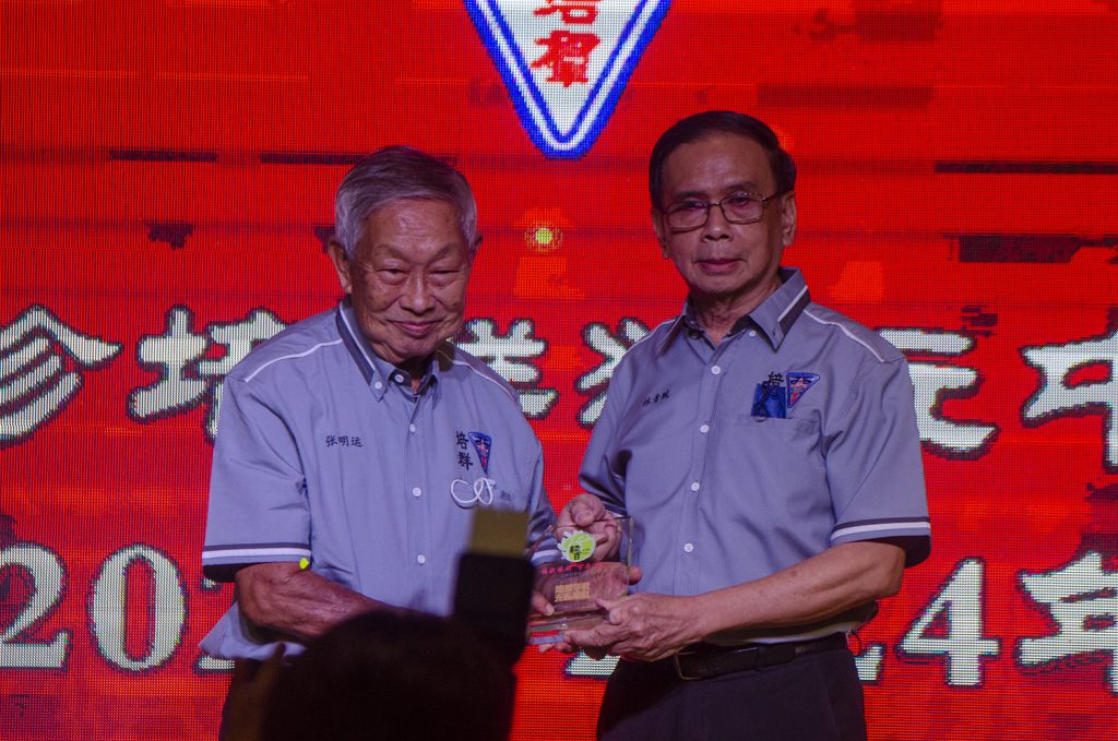 林青赋董事长(右)颁发纪念品予张明运(右)。