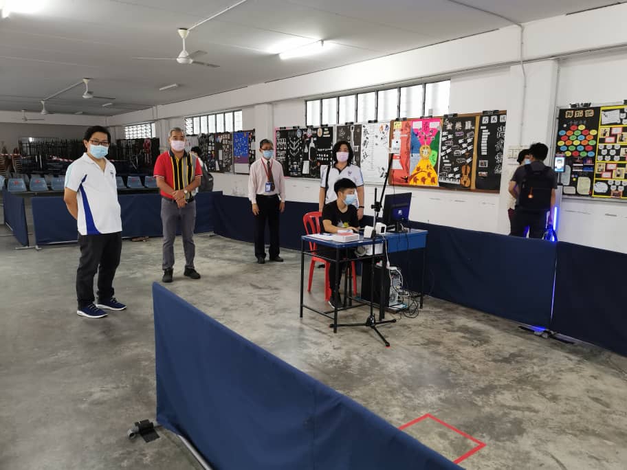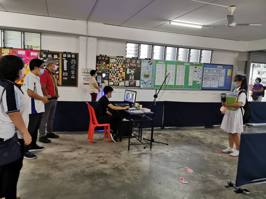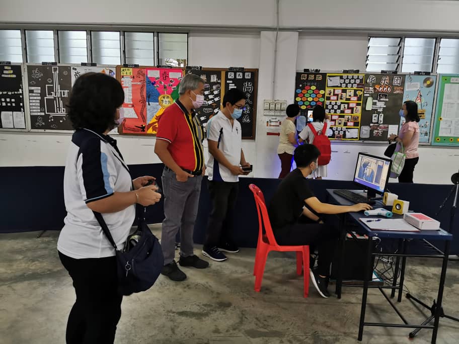 培群独中校友会署理会长陈秀莲、总务郑伟亮与副总务黄如龙,在校长黄金贵的陪同下,于6月29日上午7时,趁SPM高二生返校上课首日,实地视察体温测量仪的操作,了解整个检测流程。培群独中校友会诸位理事十分满意体温测量仪的测量速度与实用性。