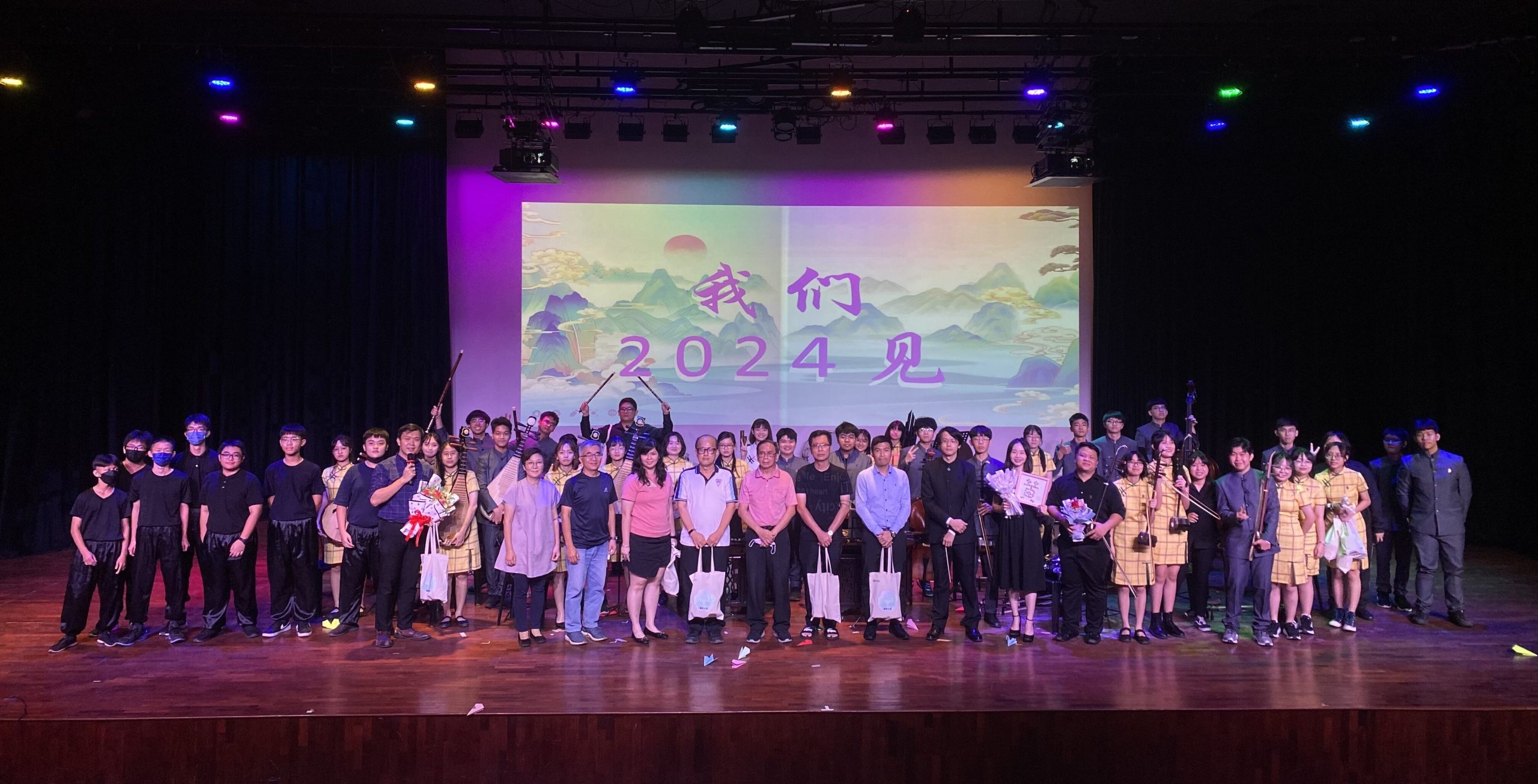 音乐会大合照,出席者包括 林青赋董事长(前排左五)、沈志坚校长(前排左四)、黄建明董事(前排左六)、联课主任沈欣蕾副校长(前排左三)、新纪元大学学院代表(前排左七)、教务主任陈俊华(前排左二)、辅导主任马慈真(前排左一)、指导教练 谢焕斌老师(前排左八)等
