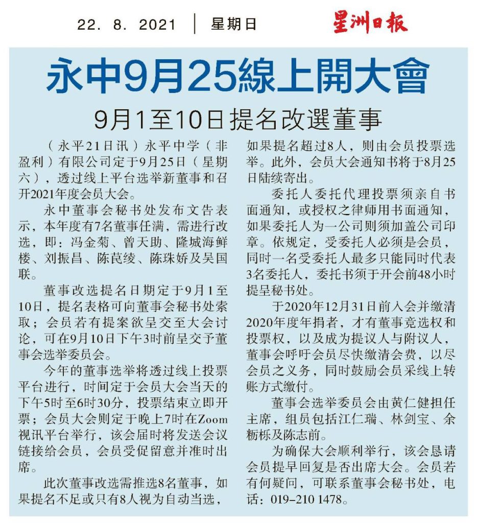 (永平21日讯)永平中学(非盈利)有限公司定「9月25日(星期六),透过线上平台选举新董事和召开2021年度会员大会。