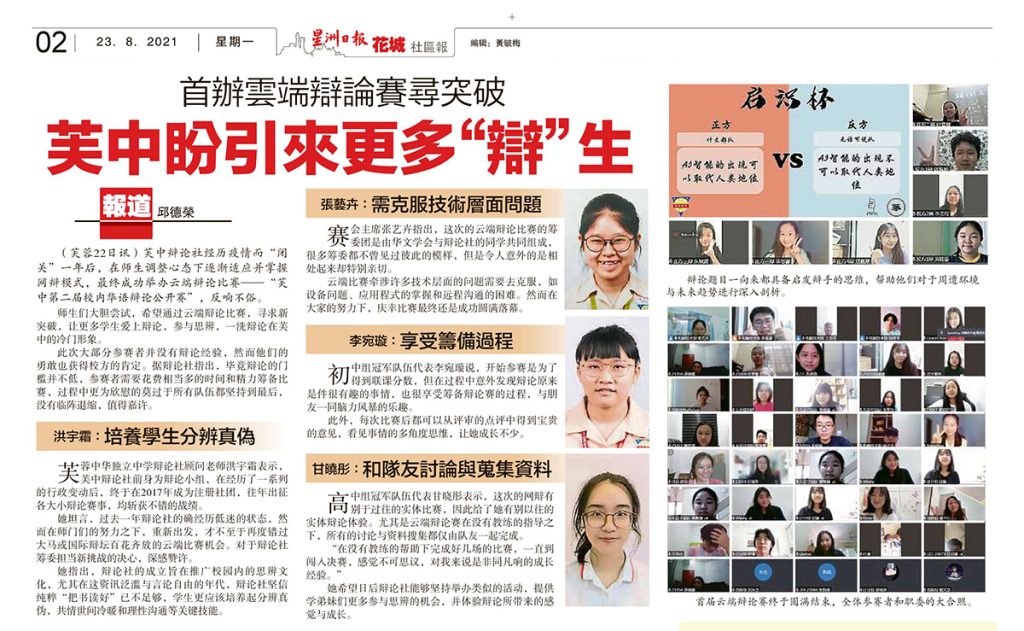 (芙蓉22日讯)芙中辩论社经历疫情而“闭关”一年后,在师生调整心态下逐渐适应并掌握网辩模式,最终成功举办云端辩论比赛——“芙中第二届校内华语辩论公开赛”,反响不俗。