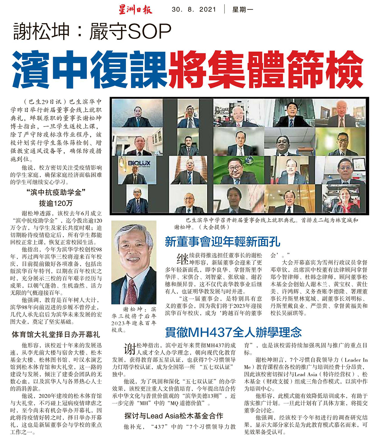 (巴生29日讯)巴生滨华中学昨日举行新届董事会线上就职典礼,蝉联原职的董事长谢松坤博士指出,一旦学生返校上课,除了严守防疫标准作业程序,该校计划实行学生集体筛检制、增强教室通风设备等,确保防疫措施到位。