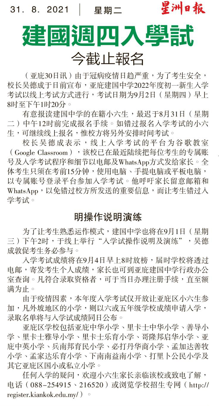 (亚庇30日讯)由于冠病疫情日趋严重,为了考生安全,校长吴德成于日前宣布,亚庇建国中学2022年度初一新生入学考试以线上考试方式进行,考试日期为9月2日(星期四)早上8时至下午1时20分。