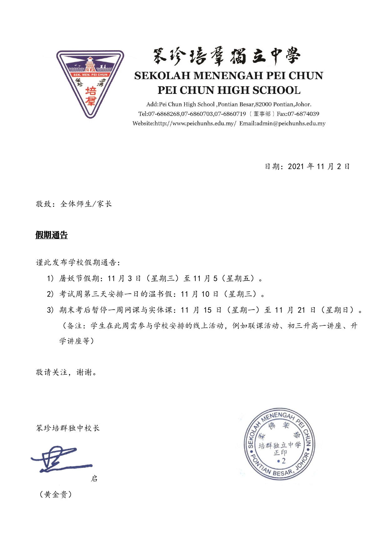 假期通告 谨此发布学校假期通告: 1) 屠妖节假期:11 月 3 日(星期三)至 11 月 5(星期五)。 2) 考试周第三天安排一日的温书假:11 月 10 日(星期三)。 3) 期末考后暂停一周网课与实体课:11 月 15 日(星期一)至 11 月 21 日(星期日)。 (备注:学生在此周需参与学校安排的线上活动,例如联课活动、初三升高一讲座、升 学讲座等) 文章导航 线上公益讲座《压力与情绪管理》 马来西亚笨珍培群独立中学专场宣讲会