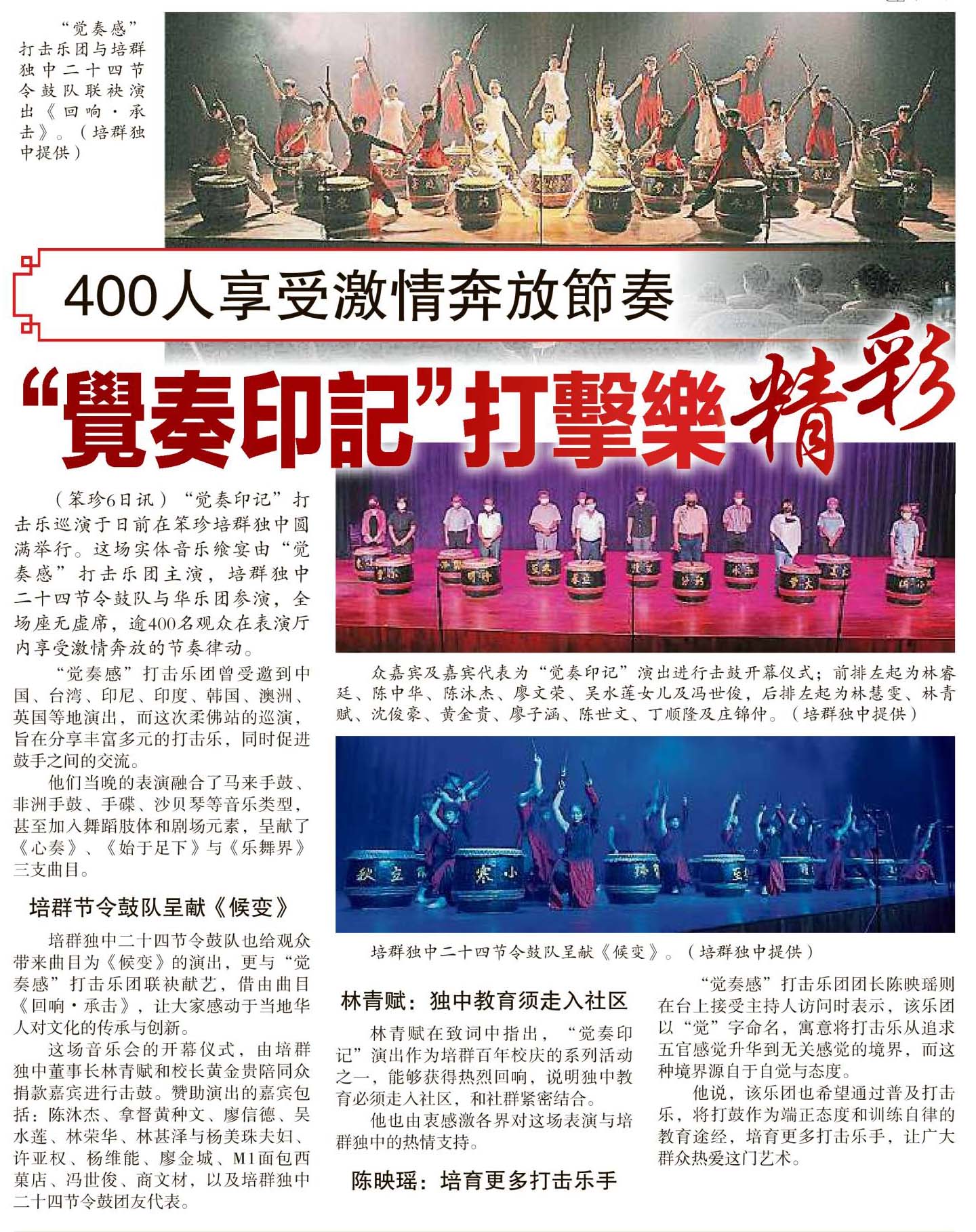 (笨珍6日讯)“觉奏印记”打击乐巡演于日前在笨珍培群独中圆满举行。这场实体音乐飨宴由“觉奏感”打击乐团主演,培群独中二十四节令鼓队与华乐团参演,全场座无虚席,逾400名观众在表演厅内享受激情奔放的节奏律动。