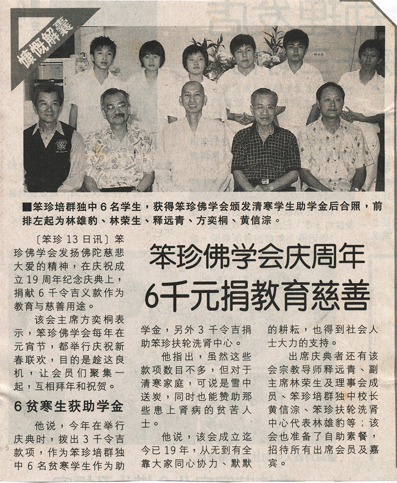 〔笨珍13日讯〕笨珍佛学会发扬佛陀慈悲大爱的精神,在庆祝成立19周年纪念庆典上,捐献6千令吉义款作为教育与慈善用途。
