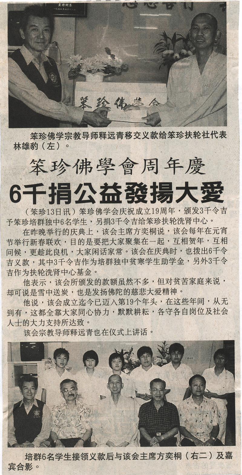 (笨珍13日讯)笨珍佛学会庆祝成立19周年,颁发3千令吉予笨珍培群独中6名学生,另捐3千令吉给笨珍扶轮洗肾中心。