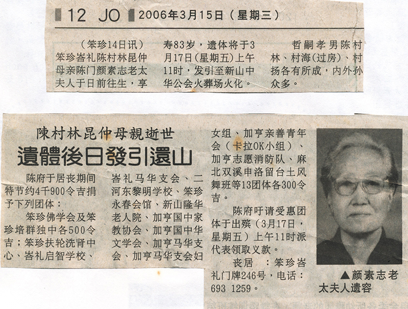 (笨珍14日讯)笨珍峇礼陈村林昆仲母亲陈门颜素志老太夫人于日前往生,享寿83岁,遗体将于3月17日(星期五)上午11时,发引至新山中华公会火葬场火化。