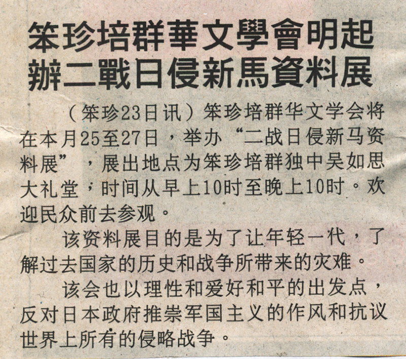 星洲日报2006.03.24 笨珍培群华文学会明起办二战日侵新马资料展 (笨珍23日讯)笨珍培群华文学会将在本月25至27日,举办“二战日侵新马资料展”,展出地点为笨珍培群独中吴如思大礼堂,时间从早上10时至晚上10时。欢迎民众前去参观。 该资料展目的是为了让年轻一代,了解过去国家的历史和战争所带来的灾难。 该会也以理性和爱好和平的出发点,反对日本政府推崇军国主义的作风和抗议世界上所肴的侵略战争。 文章导航 笨珍培中校友联谊会26日开大会颁奖励金 笨珍培群独中今起办二战资料展