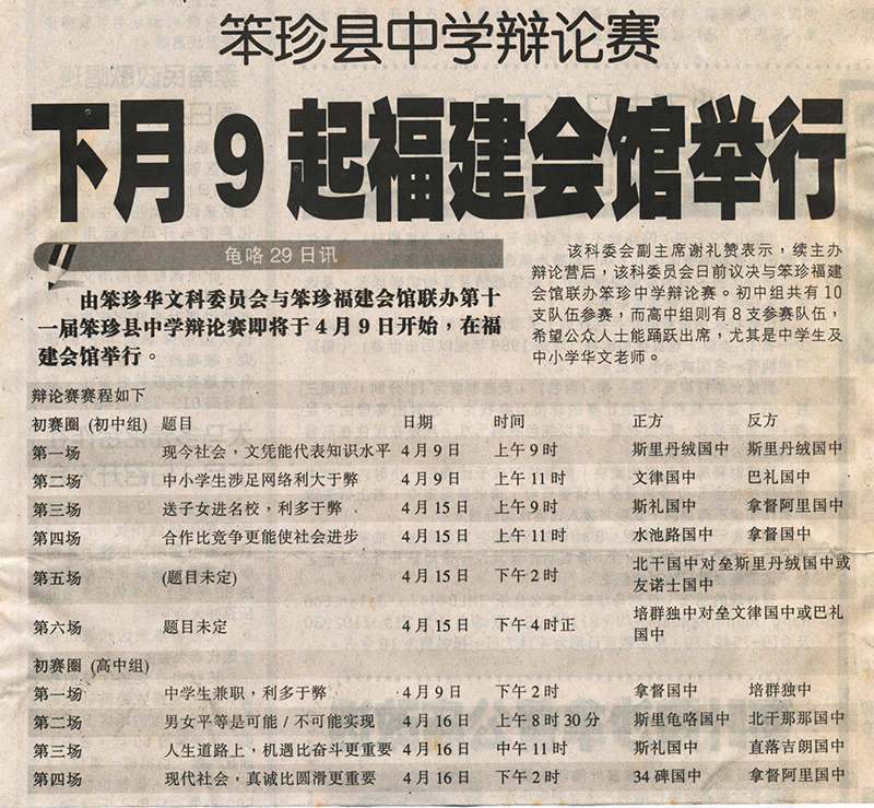 笨珍县中学辩论赛 下月9日起福建会馆举行