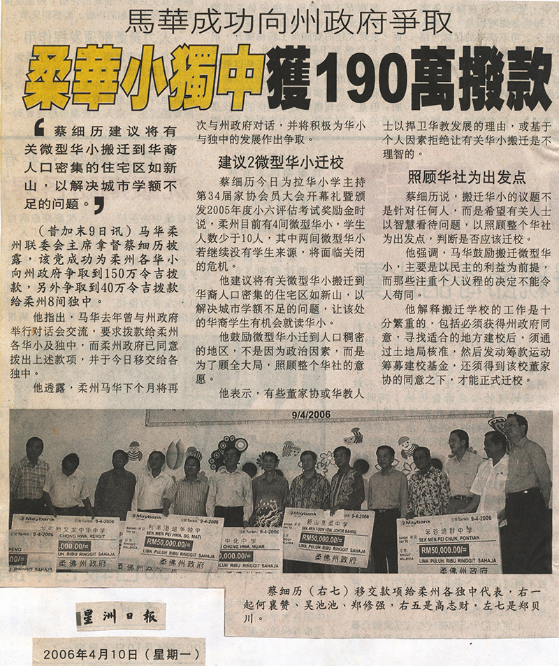 (昔加末9日讯)马华柔州联委会主席拿督蔡细历披露,该党成功为柔州各华小向州政府争取到150万令吉拨款,另外争取到40万令吉拨款给柔州8间独中。