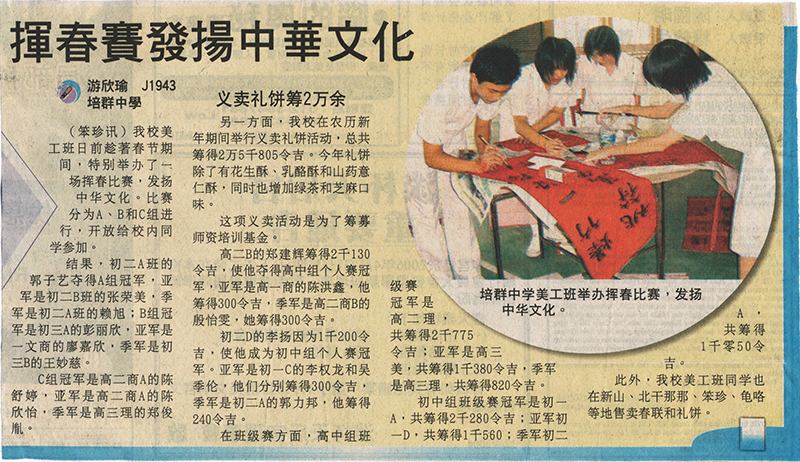 (笨珍讯)我校美工班日前趁着春节期间,特别举办了一场挥春比赛,发扬中华文化。比赛分为A、B和C组进行,开放给校内同学参加。