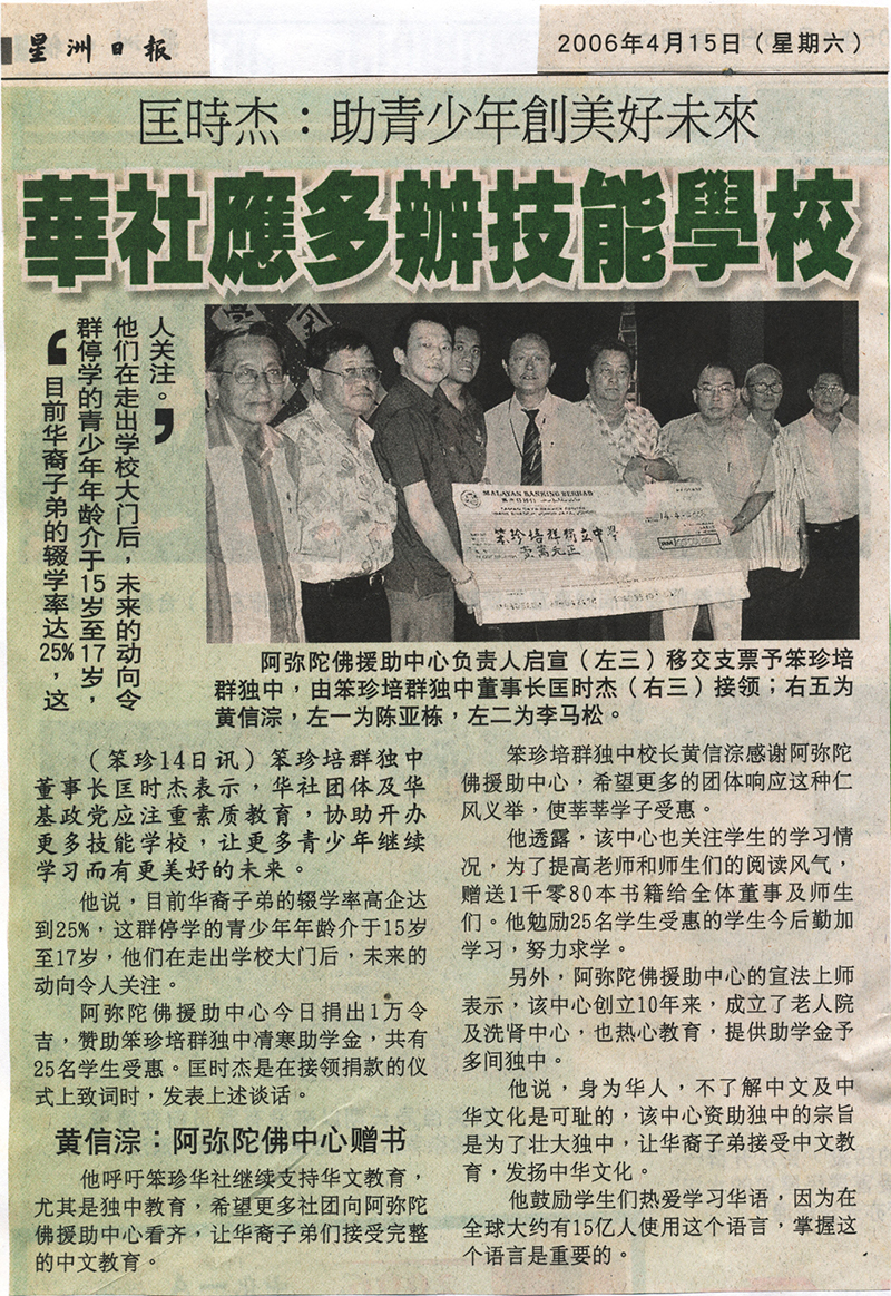 他呼吁笨珍华社继续支持华文教育,尤其是独中教育,希望更多社团向阿弥陀佛援助中心看齐,让华裔子弟们接受完整的中文教育。