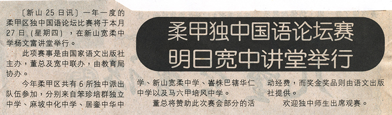 南洋商报2006.04.26 柔甲独中国语论坛赛明日宽中讲堂举行 〔新山25日讯〕一年一度的柔甲区独中国语论坛比赛将于本月27日(星期四),在新山宽柔中学杨文富讲堂举行。 此项赛事是由国家语文出版社主办,董总及宽中联办,由教育局协办。 今年柔甲区共有6所独中派出队伍参加,分别来自笨珍培群独立中学、麻坡中化中学、居銮中华中学、新山宽柔中学、峇株巴辖华仁中学以及马六甲培风中学。 董总将赞助此次赛会部分的活动经费,而奖金奖品则由语文出版社提供。 欢迎独中师生出席观赛。 文章导航 柔甲独中国语论坛赛 明新山比高低 笨珍李弟仔为子授室 喜宴捐助数团体公益