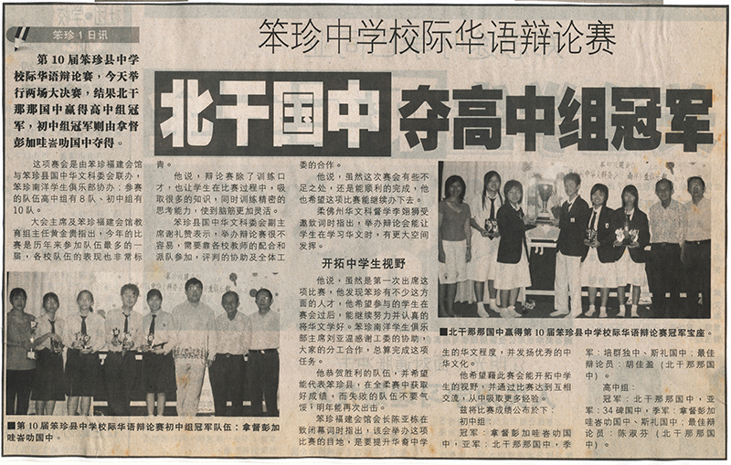 (笨珍1日讯)第10届笨珍县中学校际华语辩论赛,今天举行两场大决赛,结果北干那那国中赢得高中组冠军,初中组冠军则由拿督彭加哇峇助国中夺得。