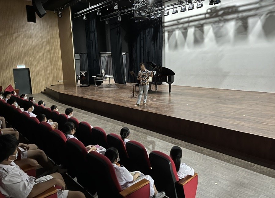 笨珍培群独中有良好的演奏厅,在我的音乐课每个月会安排不同的小型音乐会为同学介绍,钢琴、小提琴、声乐、管乐等。一开始都是先以我个人现场演奏给学生观赏,过程中不只是介绍曲目也会告诉同学音乐会的一些基本礼仪和演奏氛围,课程结束后,让学生各自写下一遍心得缴交。