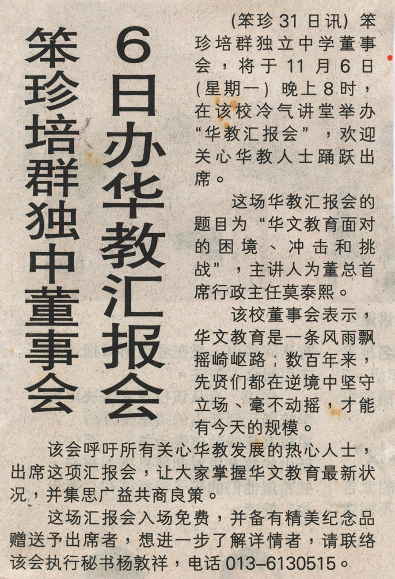 (笨珍31日讯)笨珍培群独立中学董事会,将于11月6日(星期一)晚上8时,在该校冷气讲堂举办“华教汇报会”,欢迎关心华教人士踊跃出席。