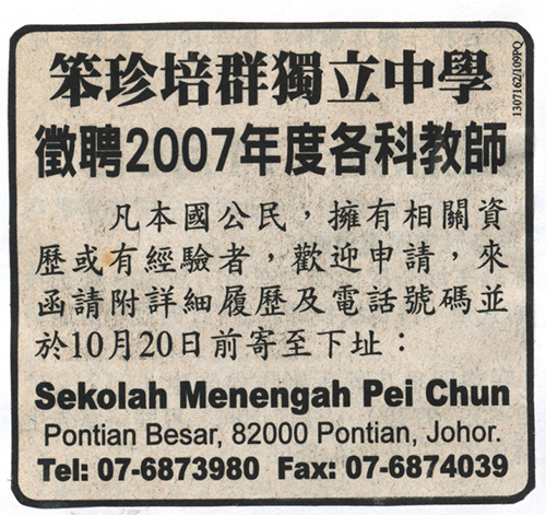 星洲日报2006.10.10 笨珍培群独立中学征聘2007年度各科教师 凡本国公民,拥有相关资历或有经验者,欢迎申请,来函请附详细履历及电话号码并于10月20日前寄至下址: Sekolah Menengah Pei Chun Pontian Besar,82000 Pontian, Johor. Tel:07-6873980 Fax:07-6874039 文章导航 笨珍莫来文德配逝世 丧府节约助公益 培群独中办联欢宴 22日董事就职筹电脑室基金