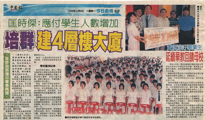 (笨珍5日讯)笨珍培群独中董事长匡时杰医生指出,为应付学生人数的不断增加,该校计划建一座4层楼大厦,预计建筑费达200万令吉。