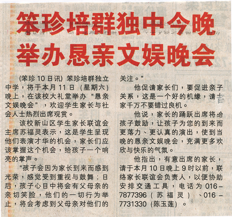 (笨珍10日讯)笨珍培群独立中学,将于本月11日(星期六)晚上,在该校大礼堂举办“恳亲文娱晚会”,欢迎学生家长与社会人士热烈出席观赏。
