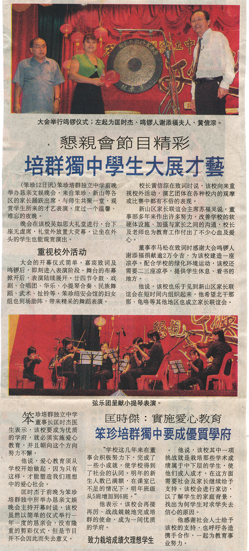 笨珍培群独立中学本董事长匡时杰医生表示,该校要成为优质的学府,就必须实施爱心教育,并且朝向这个方向努力不懈。