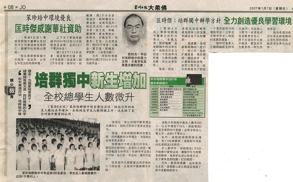 (笨珍6日讯)笨珍培群独中董事长匡时杰表示,“有教无类,因材施教”是培群独中的办学方针,该校会尽全力创造一个优良学习环境,让教师会教乐教,学生会学乐学。